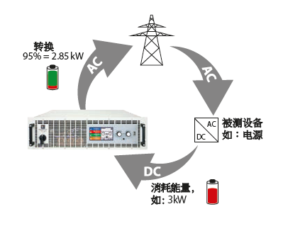 本負載最主要的特點是其AC輸入端,即電網連接端,也可用作直流電返回的輸出端,轉換效率高達95%。這種能量轉換方式有助于降低用電成本,且避免使用昂貴的制冷系統,因為普通電子負載使用過程中會將直流輸入電量轉化成熱量,從而需要制冷系統進行冷卻。